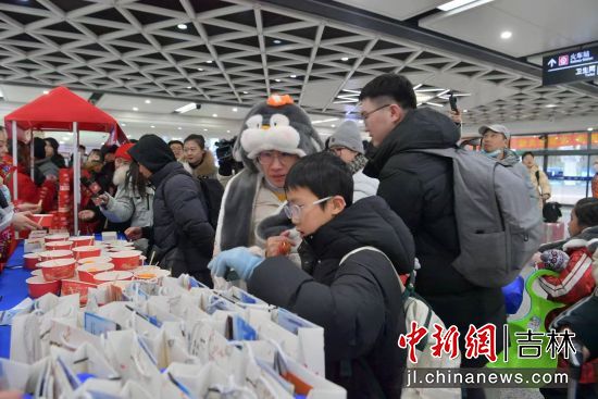 在出站口,《大東北我的家鄉(xiāng)》音樂響起,游客剛下火車便被充滿東北風情的快閃表演吸引,免費品嘗的凍柿子、凍梨、冰糖葫蘆,免費領取綠園文旅游玩攻略和多種購物優(yōu)惠券,讓全國各地的游客剛踏上東北的土地,就感受到的東北人的熱情。