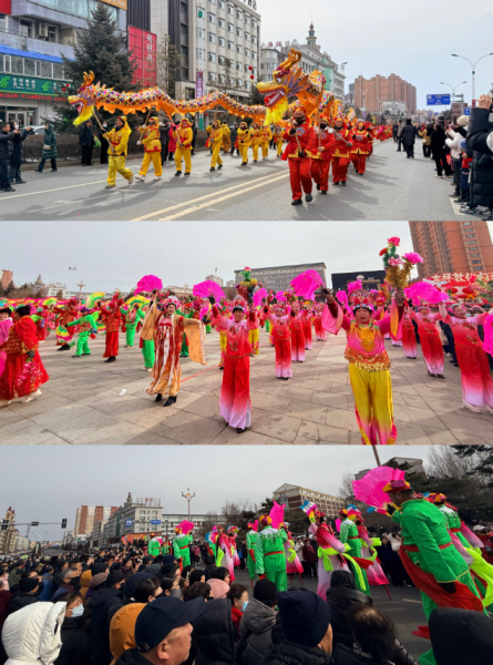 20支秧歌隊伍從大劇院出發(fā),沿南湖大街至敖東大街與長白路交匯處行進展演,傳統(tǒng)東北大秧歌、滿族秧歌輪番登場,踩高蹺、舞龍舞獅……各類非遺絕活悉數(shù)展現(xiàn)。樂隊嗩吶與鑼鼓镲交織出快慢錯落的傳統(tǒng)曲牌,演員們將秧歌的精髓演繹得淋漓盡致,成為街頭流動的風景線,隊伍一路載歌載舞,所到之處歡呼不斷,喜慶氛圍遍布敦城街巷,生動展現(xiàn)“吉祥敦化”的和諧盛景。