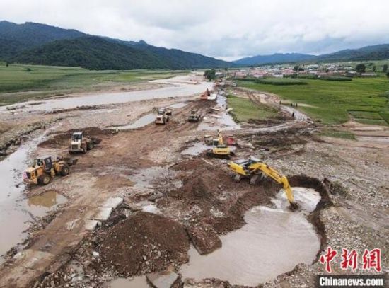工程車輛正在搶修道路。(無(wú)人機(jī)照片) 記者 蒼雁 攝