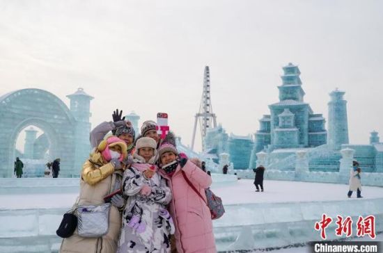 1月4日,第25屆哈爾濱冰雪大世界內(nèi)的冰雕吸引游客觀看。白天的冰雪大世界,游客仿佛置身現(xiàn)實(shí)版“冰雪奇緣”。圖為來自北京的游客“打卡”拍照。(資料圖)趙宇航 攝