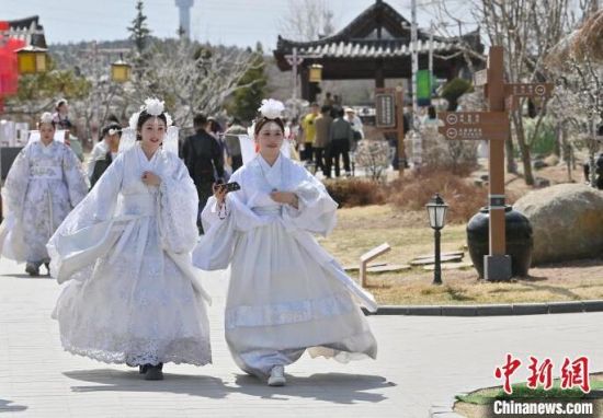 4月7日,在吉林省延吉市的中國朝鮮族民俗園內(nèi),游客身著朝鮮族服飾游玩!≈行律缬浾 張瑤 攝