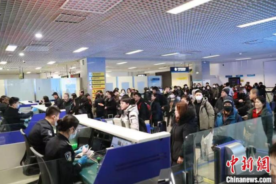 今年春節(jié)假期期間,入境旅客在延吉機(jī)場排隊等候查驗。(資料圖)麻馨允 攝
