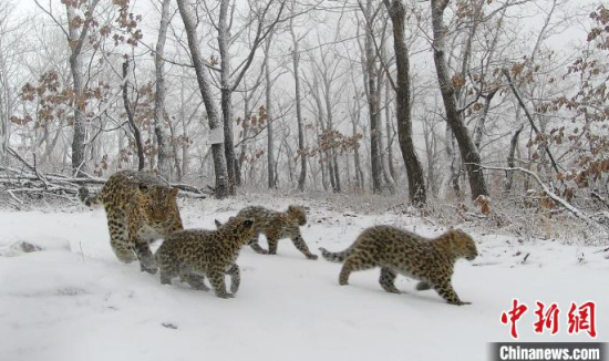 2024年12月2日,在東北虎豹國(guó)家公園東寧轄區(qū),四只東北豹冒雪活動(dòng)。(資料圖)(東北虎豹國(guó)家公園管理局供圖)