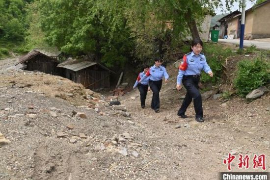“女子警務(wù)團(tuán)”來到村里走訪。崔藝琳(右一)說,轄區(qū)里很多村子道路難行,但從沒阻止她們前行的腳步。 張瑤 攝