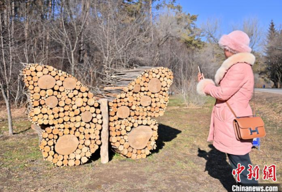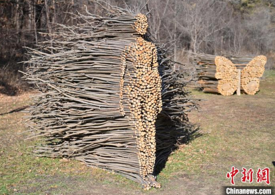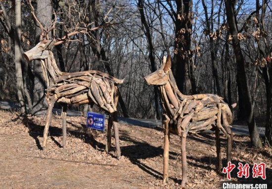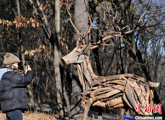 11月18日,在位于吉林長(zhǎng)春的凈月潭國(guó)家級(jí)風(fēng)景名勝區(qū)內(nèi),游客在參觀雕塑。凈月潭國(guó)家級(jí)風(fēng)景名勝區(qū)的工作人員利用一個(gè)月的時(shí)間,用掉落的枯枝制作成多處雕塑,成為冬日一景。中新社記者 張瑤 攝