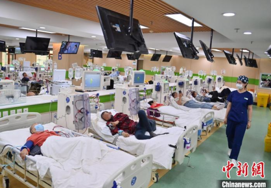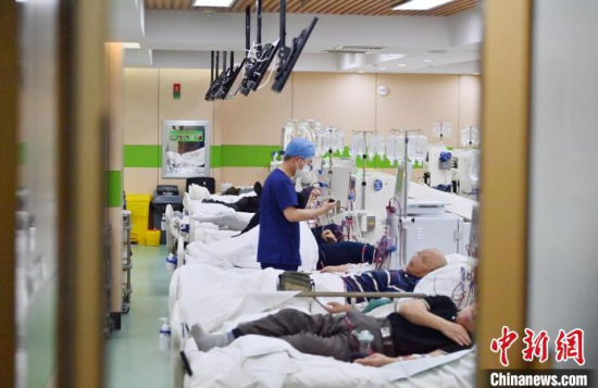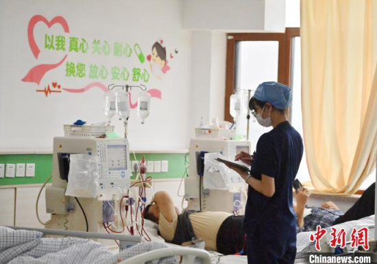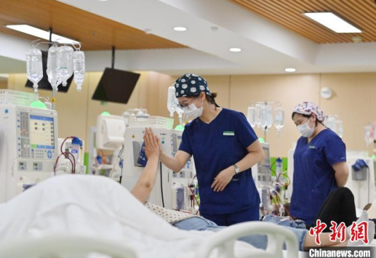 5月9日,長(zhǎng)春中醫(yī)藥大學(xué)附屬醫(yī)院腎病科透析室內(nèi),護(hù)士在為患者進(jìn)行透析治療。該科室日均接診近200名患者,每位患者的透析過(guò)程都需要數(shù)小時(shí)。治療期間,護(hù)士們會(huì)全程密切監(jiān)測(cè)患者生命體征,隨時(shí)準(zhǔn)備應(yīng)對(duì)突發(fā)狀況。多年來(lái),醫(yī)護(hù)團(tuán)隊(duì)以專業(yè)的技能和細(xì)致的關(guān)懷,持續(xù)為患者的生命健康保駕護(hù)航。中新社記者 張瑤 攝