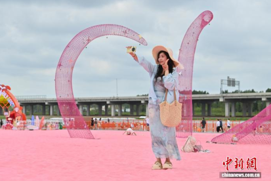 7月24日,長(zhǎng)春市一處人工打造的粉沙灘吸引眾多游客前來(lái)打卡。這片沙灘呈現(xiàn)出夢(mèng)幻的粉色,搭配周邊綠植和休閑設(shè)施,營(yíng)造出浪漫氛圍。中新社記者 張瑤 攝