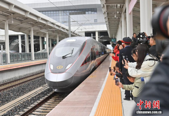 9月28日,G8166次列車從長白山站始發(fā),駛向終點站沈陽北站,沈白高鐵正式開通運營,結(jié)束了吉林省通化、白山兩市不通高鐵的歷史,北京朝陽站、沈陽北站至長白山站的最短旅行時間分別為4小時33分、1小時53分。作為中國東北高鐵網(wǎng)重要組成部分,該線路對暢通區(qū)域經(jīng)濟(jì)循環(huán)、促進(jìn)沿線旅游資源開發(fā)等具有重要作用。中新社記者 張瑤 攝