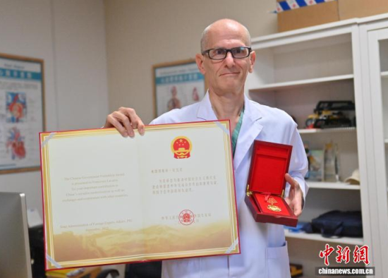 10月17日,吉林長春,意大利醫(yī)生拉瓦若展示患者送他的錦旗。十年前,他作為國際志愿者與長春結(jié)緣,被當(dāng)?shù)貙iT救助貧困心臟病患者的“吉心工程”所打動(dòng),決定留下。近日,他榮獲中國政府友誼獎(jiǎng)。他表示將繼續(xù)留在長春,培育青年醫(yī)生、優(yōu)化診療體系,讓更多患者擁有“心跳的力量”。中新社記者 張瑤 攝