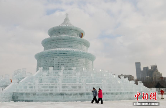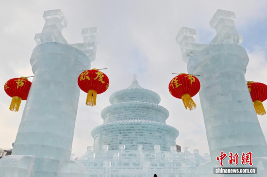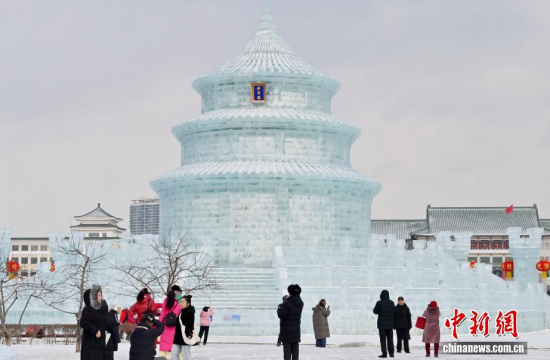 1月12日,在長(zhǎng)春市的文化廣場(chǎng)上,一座以北京天壇祈年殿為原型的巨型冰雕成為冬日一景。冰雕高約21米,用冰量5010立方米,飛檐、殿頂?shù)葌鹘y(tǒng)建筑細(xì)節(jié)均被精準(zhǔn)復(fù)刻,陽(yáng)光下晶瑩剔透,配合紅燈籠冰柱點(diǎn)綴,盡顯中式浪漫韻味,吸引眾多游客前來(lái)拍照打卡。中新社記者 張瑤 攝