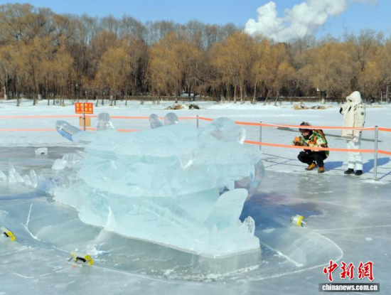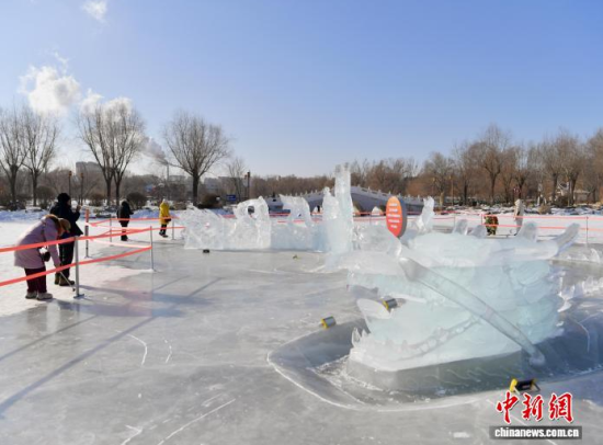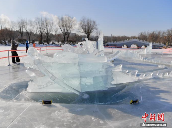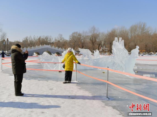 1月20日,在長春市南湖公園,“龍鳳呈祥”冰雕吸引市民駐足觀看 。該冰雕主體為一條長達45米的冰龍與一只展翅約20米的冰鳳凰組成,兩者遙相呼應,蜿蜒盤旋在冰面上。冰雕充分利用了北方冬季的自然條件,在陽光下晶瑩剔透,成為公園內一道醒目的冬日景觀。中新社記者 張瑤 攝