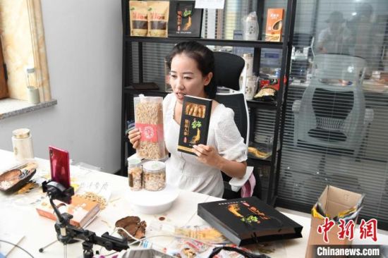 吉林參商正在網(wǎng)絡(luò)平臺直播銷售人參!埇 攝