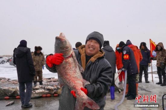 1月6日,吉林鎮(zhèn)賚,游客在哈爾淖水庫(kù)展示新捕撈上來(lái)的大魚(yú)。王凱 攝